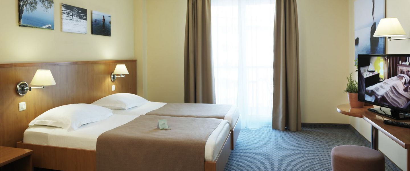 Das Hotel befindet sich in einer ruhigen Umgebung, über der Promenade von Portorož, unweit von der Meeresküste und dem Strand entfernt. Die modernen und durchdacht komfortablen Zimmer sind mit Balkon, Schreibtisch, Klimaanlage, WLAN, Telefon, LCD-Fernseher, Minibar, Safe und Badezimmer mit Badewanne oder Dusche. ausgestattet. Das Hotel ist mit einer überdachten Passage mit dem Terme Portorož und den Schwimmbädern mit thermalem Urmeer verbunden.
